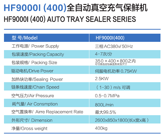 HF90001 (400) series Auto Tray Sealer adopts modified atmosphere packaging principle for adding proper proportion air mixer with